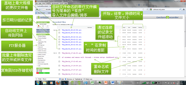 VGADVI播放一個基于Web的文件管理器來查看記錄文件,如下所示。每個文件都有一個名稱,開始時間,結束時間和持續時間字段。文件按日期分組和分段連續記錄的時間表。你可以更改文件名,上傳一個,多個或所有文件,刪除一個,多個的所有文件