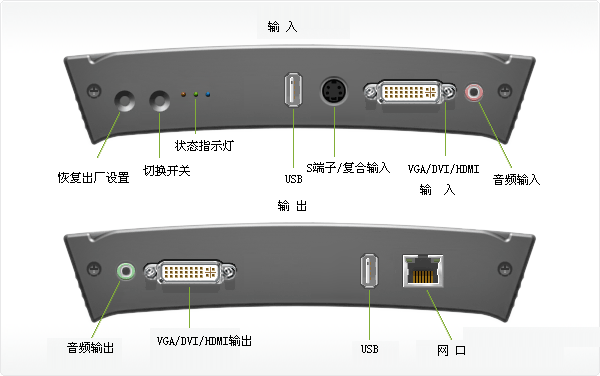 VGADVI Broadcaster是一款小巧便攜的設備,即7.95英寸x4.13英寸x1.38英寸(202x105x35mm)的大小。按鈕和接口如下所示