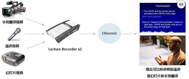 根據(jù)近期的客戶反饋,Lecture Recorder X2已經(jīng)用于有視聽障礙者參加的會議,并充分發(fā)揮其作用。客戶報告中指出:“艾普飛 Lecture Recorder X2產(chǎn)品,我們非常有興趣,因?yàn)樗m應(yīng)我們的需要。有了這個設(shè)備,我們便可以舉辦有殘障人士參與的會議。第一個輸入源是講師所提供的幻燈片或視頻流。第二個輸入源根據(jù)參與者的不同而有不同形式。當(dāng)我們與視障人士工作時,該源視頻流會隱藏字幕;當(dāng)我們與聽障人士工作時,LectureRecorder X2的第二個輸入被用于視頻流的手語翻譯。圖片流中的圖片和復(fù)用選項(xiàng)使視頻內(nèi)容完整呈現(xiàn)給與會者。音頻聲道與視頻疊加同時一并發(fā)送。該解決方案有助于殘障人士充分參與活動。“