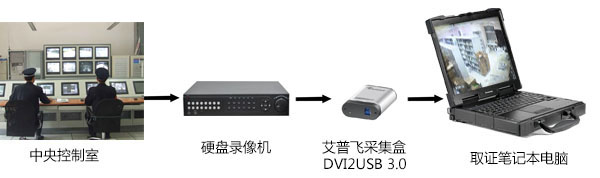 刑偵取證人員可以攜帶著筆記本電腦到控制室,然后只需將硬盤錄像機(jī)的輸出監(jiān)視口VGA或是HDMI通過線纜接入到艾普飛采集盒的輸入端,再用自帶的USB線纜接入筆記本電腦,由于艾普飛的設(shè)備非常小巧,還可以嵌入到專業(yè)的工控筆記本電腦中使用,這樣開機(jī)即可通過電腦中的專用軟件采集到硬盤錄像機(jī)的所有操作及回放視頻畫面,用此做為打擊罪范的最有力的證據(jù)。