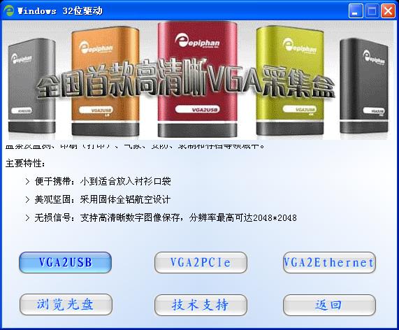 2. 選擇所使用的Epiphan產品,點擊“VGA2USB”安裝驅動程序及Epiphan Capture Tool捕獲工具。