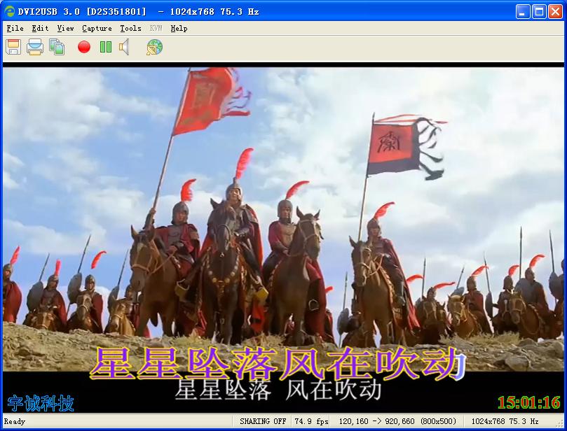 6. 現在就是設置完成后的實時預覽效果,如下圖所示,幀速率達到了59.8fps,采集大小由1024x768剪切為800x500,并在視頻的左下角顯示了自己的文字和右下角顯示了當前的時間。