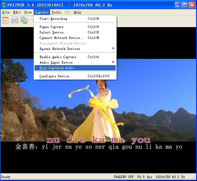 3. 單擊“Capture”菜單下“Audio Input Device”選項,選擇音頻輸入設備為“DVI2USB 3.0……”。