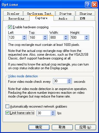 4. 若只想采集信號中的某一區域視頻,則可在“Capture”選項中將“Enable hardware cropping”勾選并設置相應參數即可,更下端的“Limit frame rate to 30 fps”是將視頻幀速率限定到了30fps,取消后將不受限制進行采集。