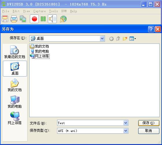 9. 現在點擊工具欄中的紅色按鈕會彈出“另存為”的窗口,如下圖所示,選擇輸入視頻存放的位置及名稱后,點擊“保存”按鈕即可開始錄制視頻。