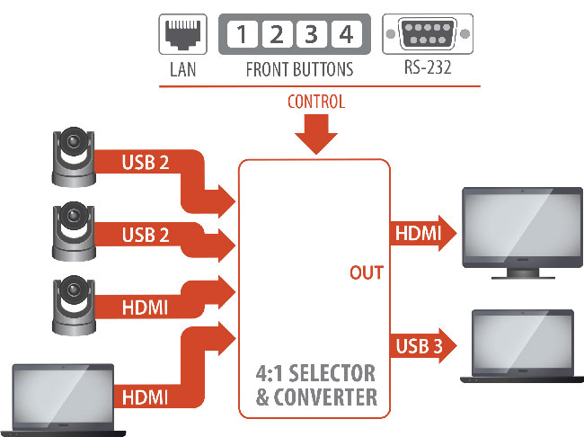 使用Inogeni CAM系列的多路攝像機選擇器,您的會議可以像您想要的一樣。 CAM產品可讓您從按鈕或遠程中選擇四個來源之一。使用SHARE2,您可以呈現和敘述PowerPoint程序,切換一個揚聲器和一個組的圖像之間,將一個攝像頭集中在面試官和受訪者上,呈現并解釋電子表格或數字化的X光片等。通過實踐,您可以使一個相機全屏,并更改其他相機或光源正在關閉的屏幕上。