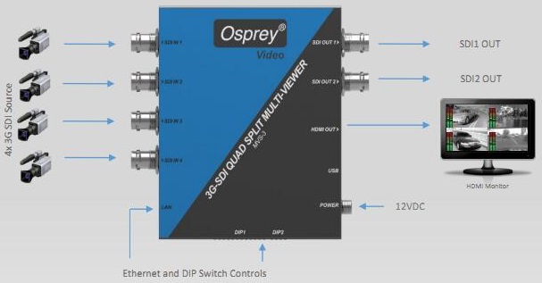 當用作縮放轉換器時,四個3G-SDI輸入中的任何一個可以傳輸到三個并行輸出(2個3G-SDI,1個HDMI)并根據需要進行縮放;用作多畫面融合時,可以將兩個或多個輸入引導至輸出并以各種布局顯示。輸出分辨率和幀速率可以設置為任何SMPTE支持的標準。此外,音頻條可以覆蓋在每個通道上,以進行快速信號監控。