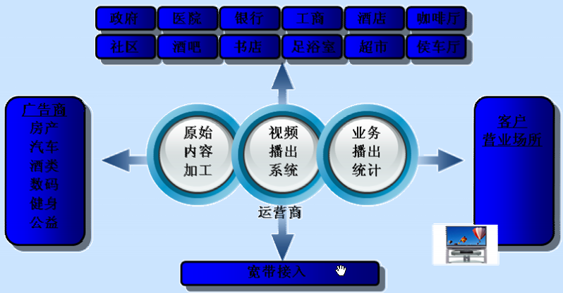 整套系統(tǒng)運(yùn)行在X86計(jì)算機(jī),Windows操作系統(tǒng)。支持的廣告和節(jié)目?jī)?nèi)容可以是圖片,幻燈片,視頻,flash動(dòng)畫(huà),文本,滾動(dòng)字幕,列車進(jìn)站倒計(jì)時(shí),標(biāo)清高清TS流播放等。