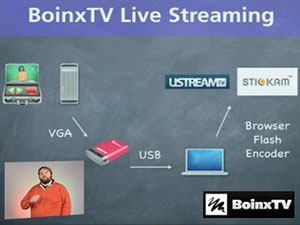 BoinxTV用戶還可以使用VGA2USB將采集到的視頻流上傳到互聯網。“ 使用VGA2USB,用戶可以在另一臺MAC電腦上部署諸如uStream、Stickam等視頻編碼器接收BoinxTV的輸出。 ” Breidenbach說。